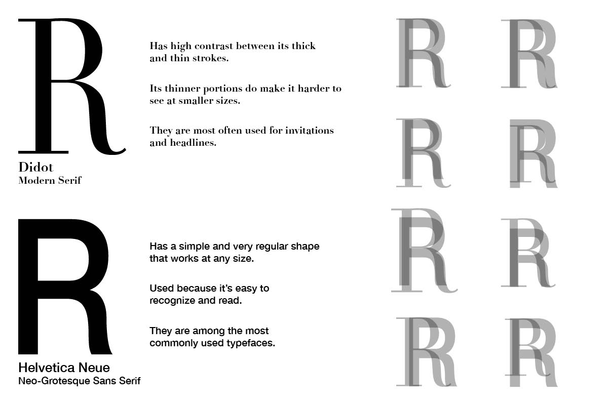 Using overlays I sought to find similarities between modern serif and sans serif typefaces in order to find shapes that I would leave or change in the new letterform.