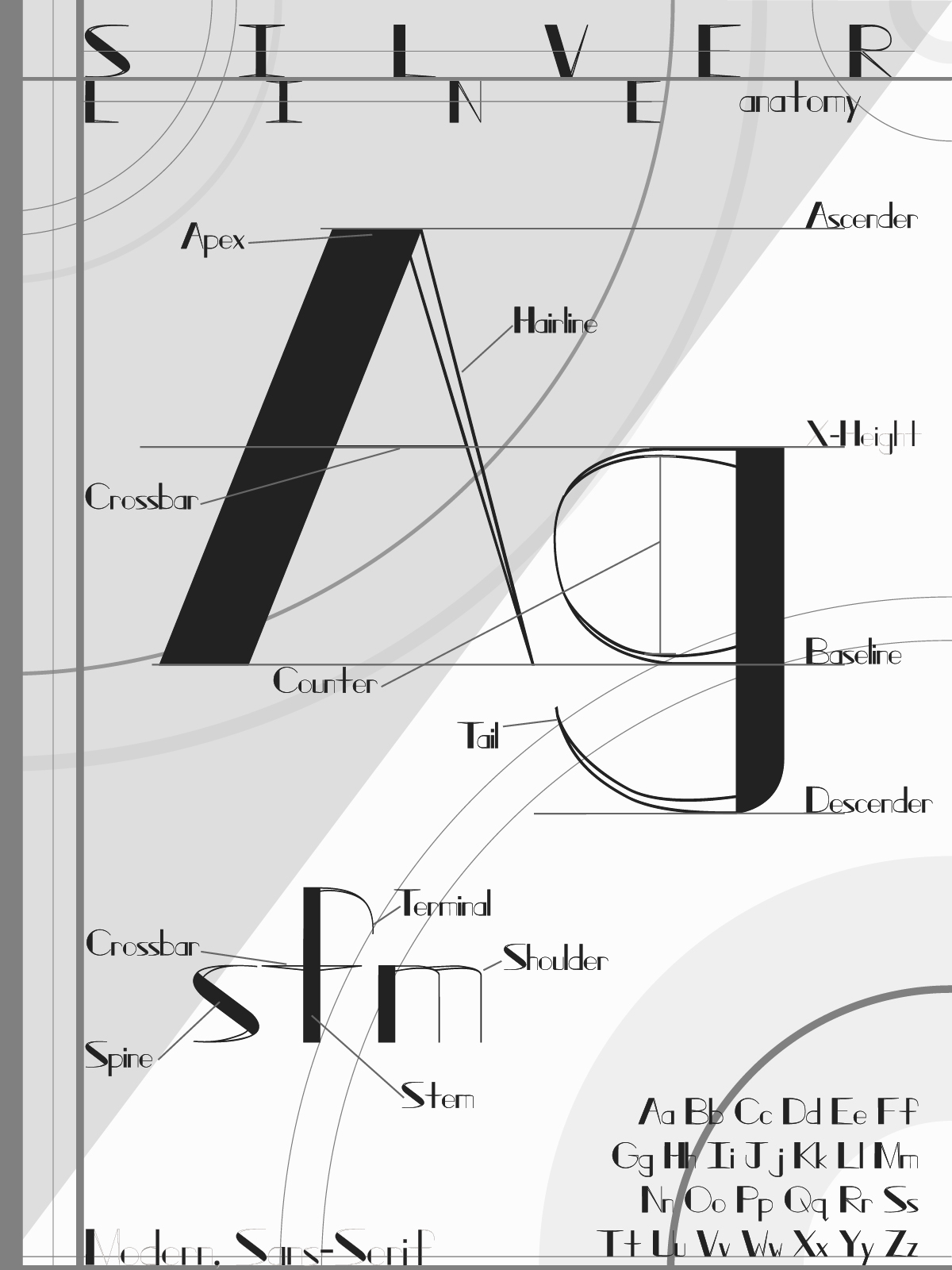 When learning about other high contrast typefaces it was noted that the thicker portions of high contrast letters are noticed first by viewers, so I designed SilverLine to be left heavy to work with how western viewers read.